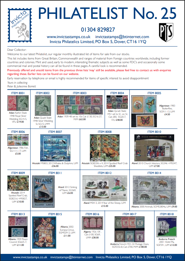 Invicta Philatelics Limited is based in Dover and run by husband and wife team Peter and Julieanne Barrett assisted by Bjorn McIver. The company owns and operates two public stamp auctions in the Dover and Bristol areas, each of these has a quarterly sale making eight stamp auctions per year. In addition to this, we issue a regular monthly retail list of items for sale called ‘Philatelist’, which is a fully illustrated list. We currently have a small shop on Delcampe, the European equivalent of eBay, which we plan to expand over the coming months on an ongoing basis. WE have plans for other retail lists time permitting. We are members in good standing of the Philatelic Traders Society (P.T.S.). Do not hesitate to contact us if you wish to know anything else.